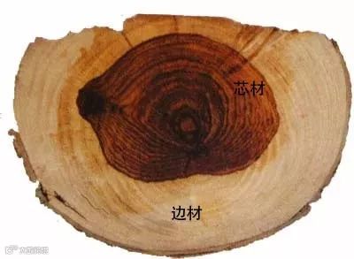 再比如说边材和心材,这两个部位的颜色就非常的明显了,边材颜色浅,水分多,材质比较差,心材颜色深,水分少,材质比较好。