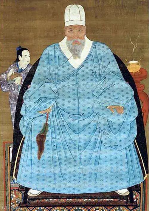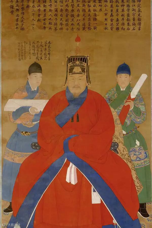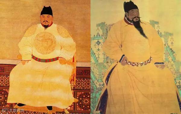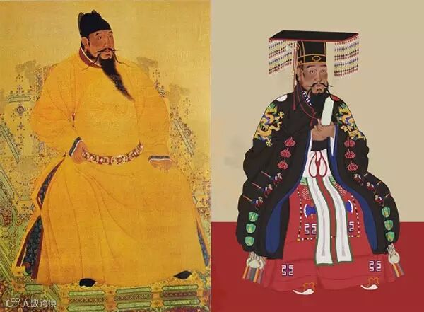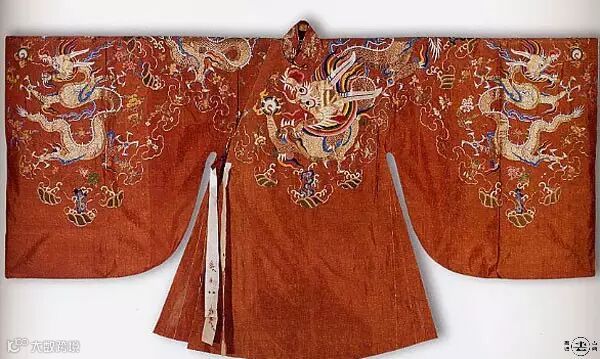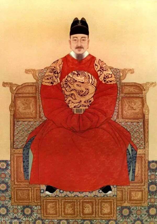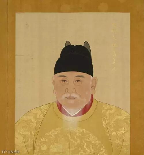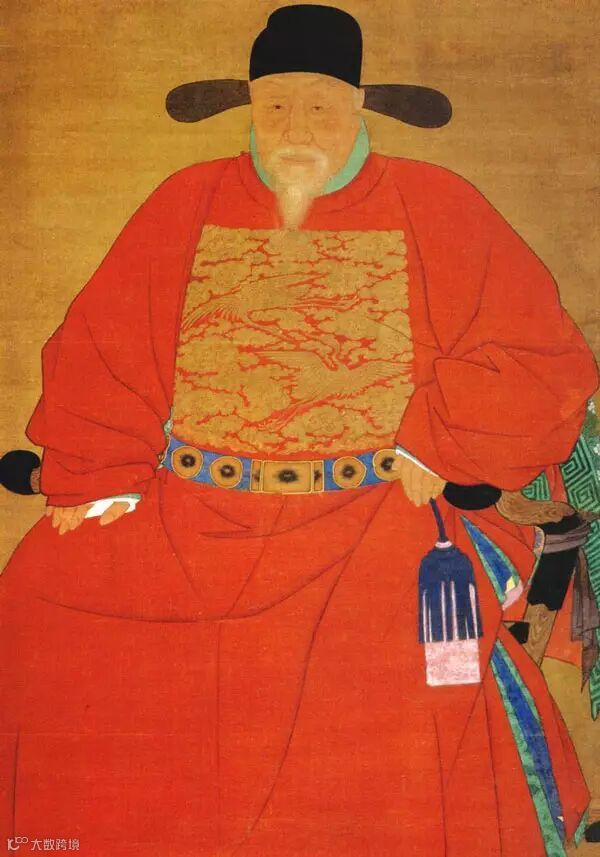 洪武皇帝所穿乃明前期皇帝常服,风格较明后期简洁,乌纱翼善冠+黄色团龙窄袖圆领袍+红色交领衣。