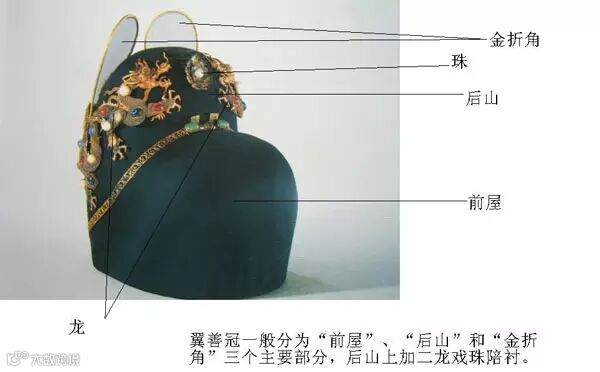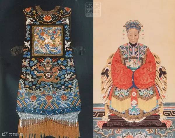 朝服特点是大襟、斜领、袖子宽松,前襟的腰际横有一下打满裥。所绣纹样,除胸前、后背两组之外,还分布在肩袖的上端及腰下(一横条)。另在左右肋下,各缝一条本色制成的宽边,当时称“摆”。