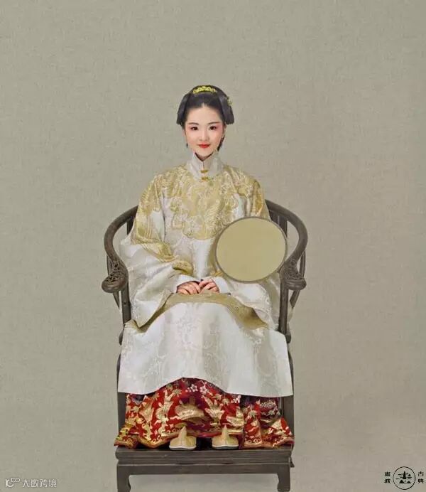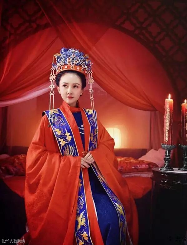 皇后之服,以百禽之首凤凰为其高贵象征,与龙相配。服真红大袖衫,上面织绣龙凤纹,加霞帔和红褙子,下穿红罗长裙。头戴龙凤冠,以金丝网为胎,上缀点翠凤凰,并挂有珠宝流苏,冠后下方有左右各三扇博鬓,展开后如同五彩缤纷的凤尾。