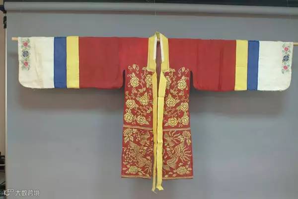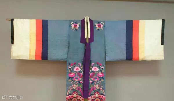 阔衣源自长褙子,在朝鲜文化里代表了长寿、幸运和富贵。礼服的面料多以枣红色贡缎、花纹缎、洋缎等做成;衬裏则多用蓝色,无花纹。