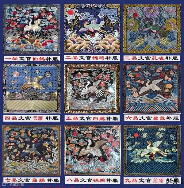 文官:禽纹以自然界中优雅、美丽的鸟类为贵。一品仙鹤,二品锦鸡,三品孔雀,四品云雁,五品白鹇,六品鹭鸶,七品鸂鶒,八品黄鹂,九品鹌鹑。