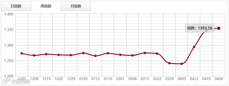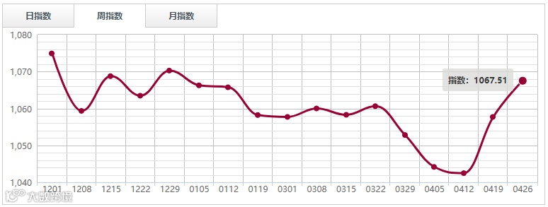 三大市场中,上海福人市场较为风光,本周销量较前一周增加了18,22%,周指数报收1531.52点,环比上涨1.78%。广东鱼珠和四川大西南周指数表现相对较差,本周指数环比下跌0.94%、1.08%,报收1144.27点、1302.96点。
