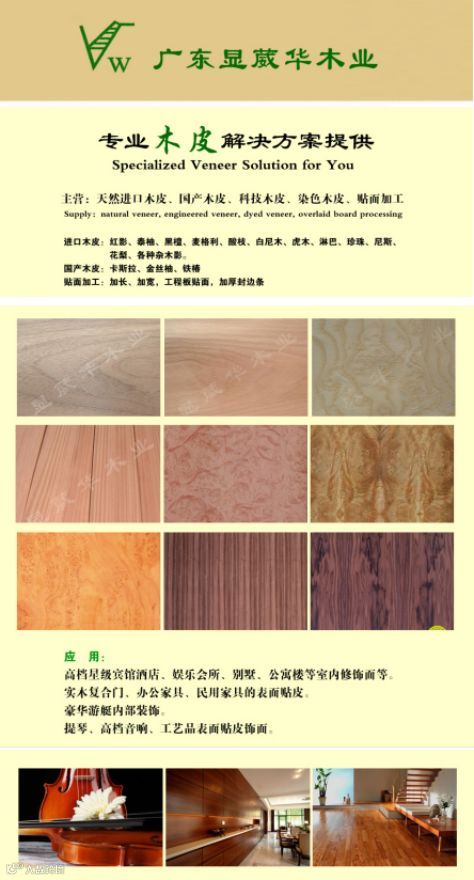 显葳华木业是多年经营进口、国产木皮、科技木皮、贴面加工、过油加工的木材企业。进口木皮有:红影、泰柚、黑檀、酸枝、虎木、珍珠等各种杂木影。国产木皮有:卡斯拉、金丝柚、铁椿等。提供贴面、过油加工:加长、加宽、工程板贴面、加厚封边条。