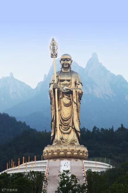 地藏菩萨露天铜像,位于安徽省四大佛教名山之一的九华山。高99米,与九华山99座山峰、金地藏享年99岁的寓意相一致。地藏菩萨右手持锡杖,左手持摩尼宝珠,整个铜像连底座高155米,是目前世界上铸造最大最高的佛教造像。