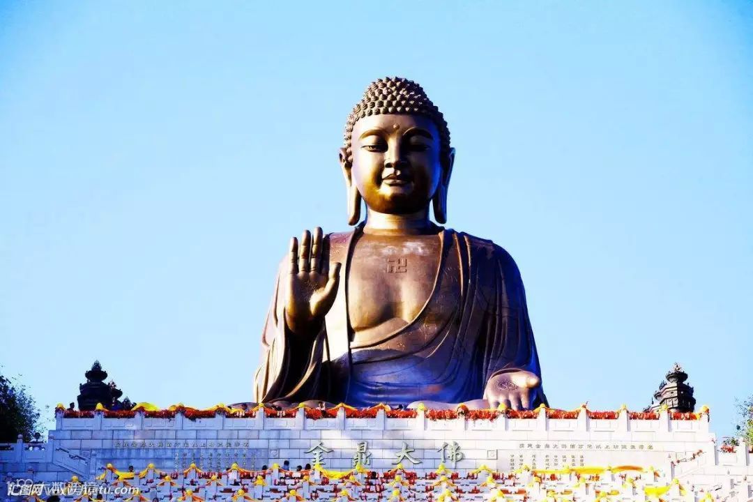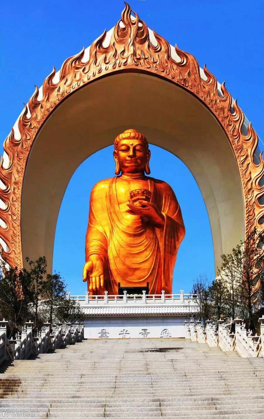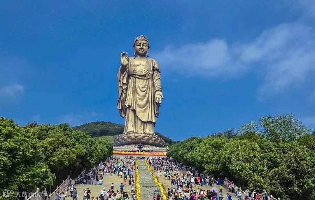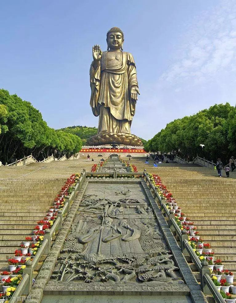 江苏的灵山大佛,通高88米。大佛所在位置系唐玄奘命名的小灵山,故名灵山大佛。大佛慈颜微笑,广视众生,右手“施无畏印”代表除却痛苦,左手“与愿印”代表给予快乐,均为祝福之相。