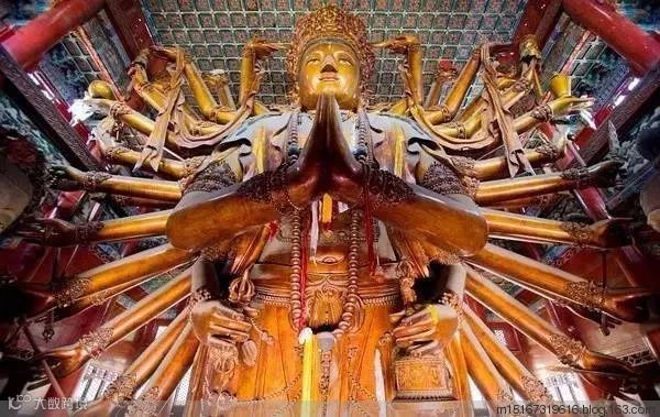 河北承德普宁寺的千手观音,世界上最大的金漆木雕佛像,高27.21米。这尊佛像代表了清代佛教造像的最高成就,其周身贴金,造像精美,宝相庄严,比例匀称,纹饰流畅,绘色绚丽,是我国雕塑艺术的杰作。