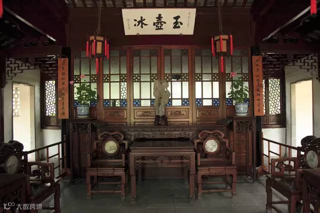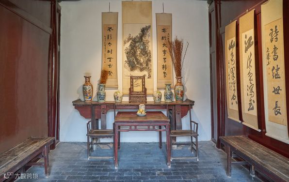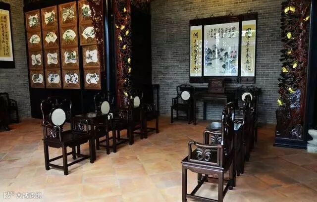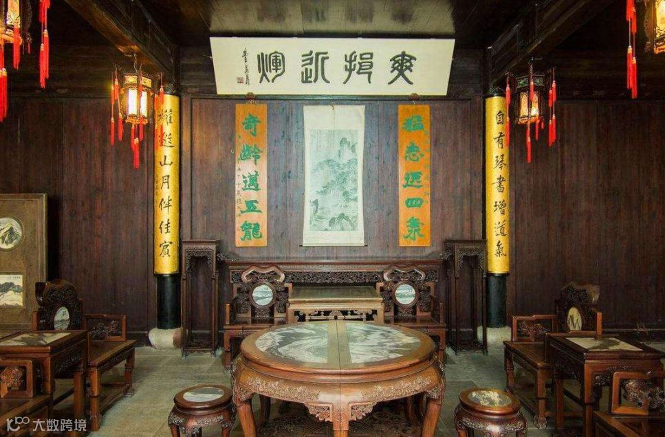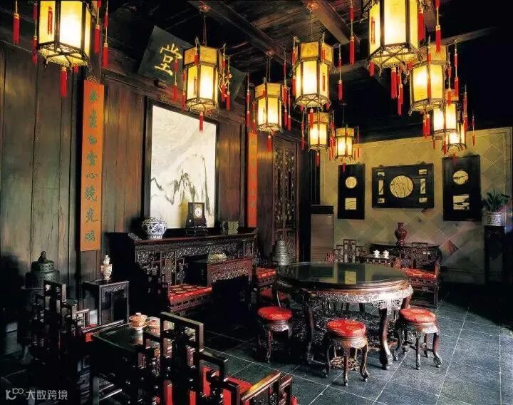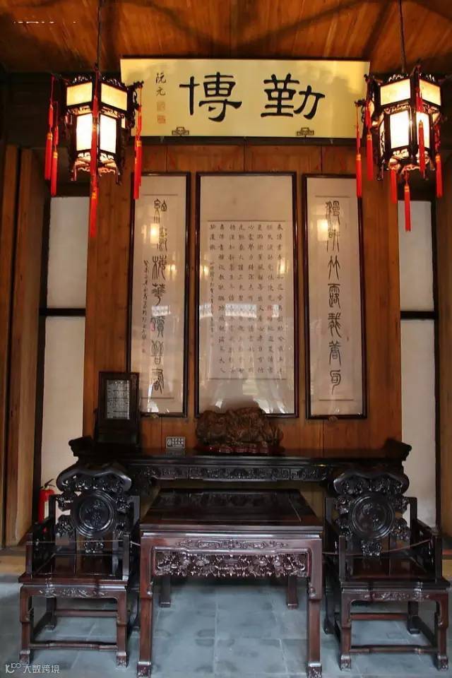 大户人家的厅堂,讲究严格有序,中规中矩,以正厅中轴线为基准,采用成组成套的对称方式摆放,家具、楹联、匾额、挂屏、书画屏条都以中轴线形成两边对称布置,庄重、高贵,非常有气派。