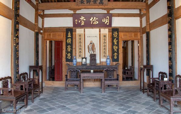 墙正中:挂中堂字画,这一定是按“皇、相、翰林、名人、格言”为序的匾额,是中国古代社会文明中的“序”和“礼”。