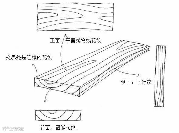 在切开的实木板材上,可以看到:三个面的花纹皆不相同。正面为抛物线花纹,抛物线或大或小;前面为圆弧状的年轮纹;侧面则是平行纹理。