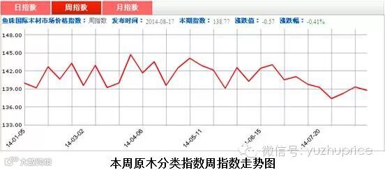 原木分类指数周指数连续两个星期拉升后本周有所回落,指数报收138.77点,周环比下跌0.57点,跌幅为0.41%。本周成交额较上周小幅增长0.54%,但总体水平依然偏低。由于市场复苏远远低于预期,不少原来较为乐观的商家心态有所转变,在忧虑情绪再次抬头的影响下指数往上走升的趋势被抑制。