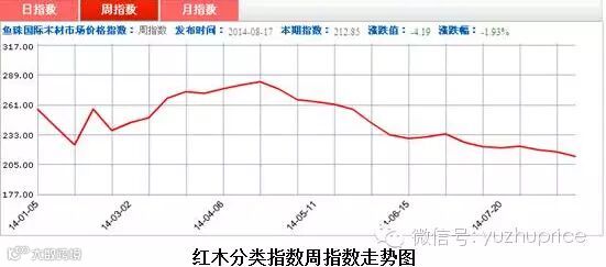 本周红木分类指数震荡不安,尤其是在周五大跌之后,市场重心明显下移。受此影响,红木分类指数周线收于212.85点,周环比跌4.19点,跌幅1.93%。从日线走势情况来看,虽然本周红木分类指数在周二周三反弹拉升给予市场一定的信心,但朦胧的利淡消息却让大盘随后剧烈震荡,周五红木分类指数失守红盘,跌至202.44点,日环比跌10.51%。虽然随后有所反弹,但收复失地已然无望。市场人士分析认为,当前红木量价不配合,并且在库存压力下,部分红木代表材种价格一跌再跌,这也就注定红木反弹空间有限。预计这样的趋势将延续至9月份。