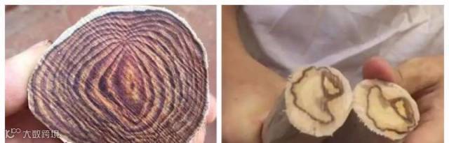 大家平常玩过不少黄花梨手串,不知有没有人见过黄花梨的原木,它在横切后一般呈有三层,除了树皮,还分白木和海黄,这里的海黄,便是指海南黄花梨的树心,也被称为油格。
