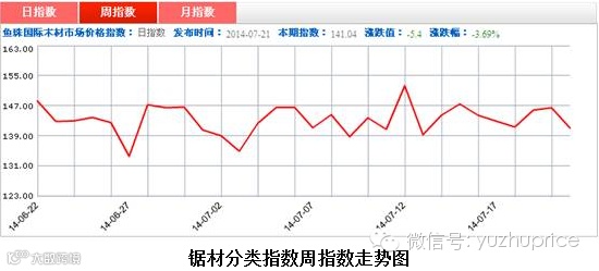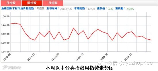原木分类指数周指数自6月底跌穿心理关口142点后持续低位徘徊。周指数本周依然未能摆脱市场颓势继续下跌,最终报收139.26点,周环比下跌0.53点,跌幅为0.38%。本周原木成交量较上周小幅增长3.758%,交易额增长4.27%,但成交量较6月均线依然下滑超过10%,市场交投疲软格局暂时难改,预计未来大盘还将低位徘徊。