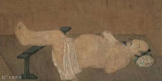 描绘一位文人躺在藤编的凉床上,半敞衣襟,双脚架高,闭着眼睛仿佛在倾听鸟的叫声,悠然自得。