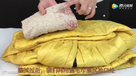 第四步:将漂洗过后的衣服裹入干毛巾,用手按压,让毛巾吸收羽绒服表面的水分。注意不要拧衣服,会让衣服变形。