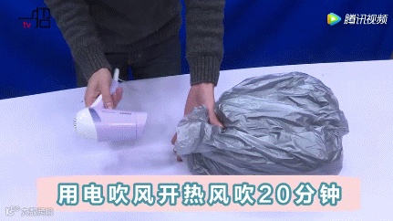 第四步:将吹风机放在塑料袋的开口处,包裹严实,开热风吹20分钟。
