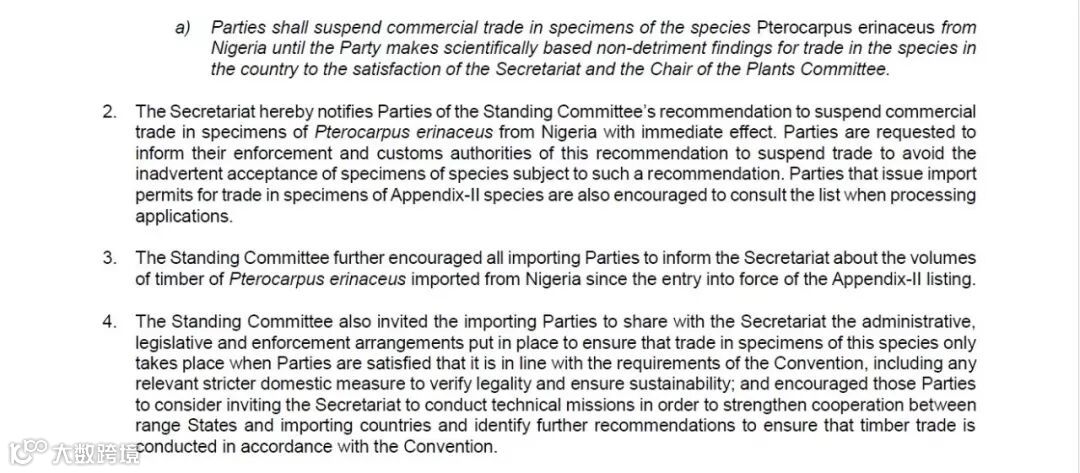 4. 常务委员会还邀请进口刺猬紫檀的缔约方与秘书处分享在管理、立法和执行方面所已经制定的实际方式,以确保只有在缔约方确信其符合公约要求时,才能进行该物种样本的交易,这包括了任何相关的更严格国内措施,以核实其合法性并确保可持续性;并鼓励这些缔约方考虑邀请秘书处进行以技术指导为目的的访问,以加强一系列原产地国家与进口国之间的合作,以进一步确定新的建议(可能形成面向各缔约方的新通知,亦或决议、裁定等),确保木材贸易活动遵照公约要求进行。