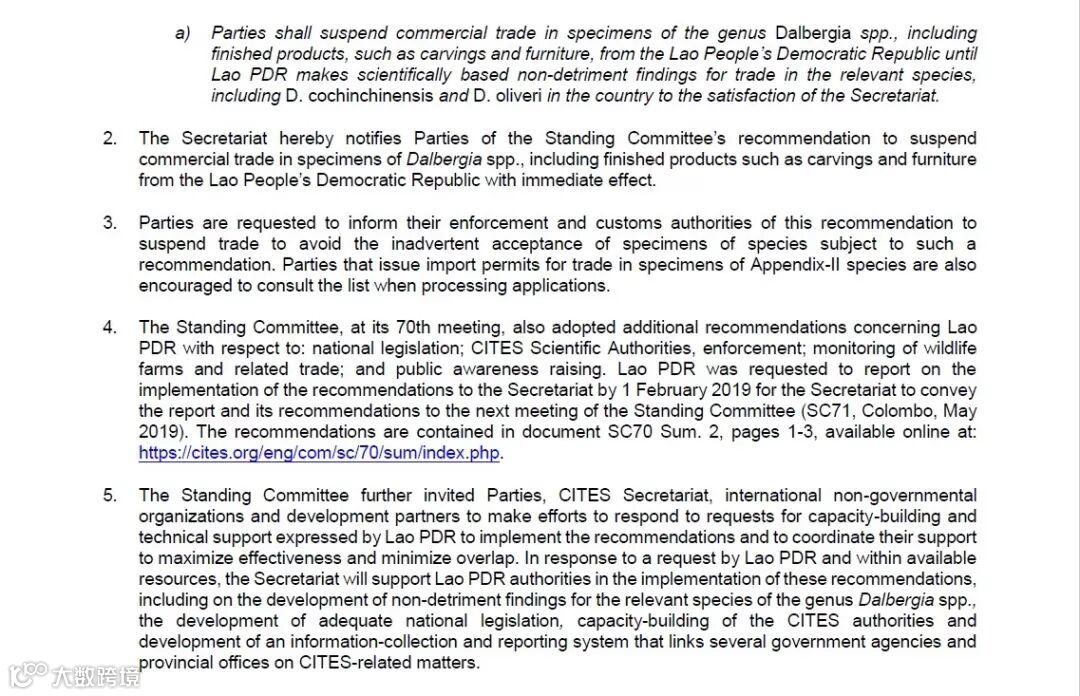 2. 秘书处特此通知各缔约方——常务委员会所建议暂停源自老挝人民民主共和国黄檀属样本的商业贸易并包括木雕刻品和家具等成品,时下立即生效。