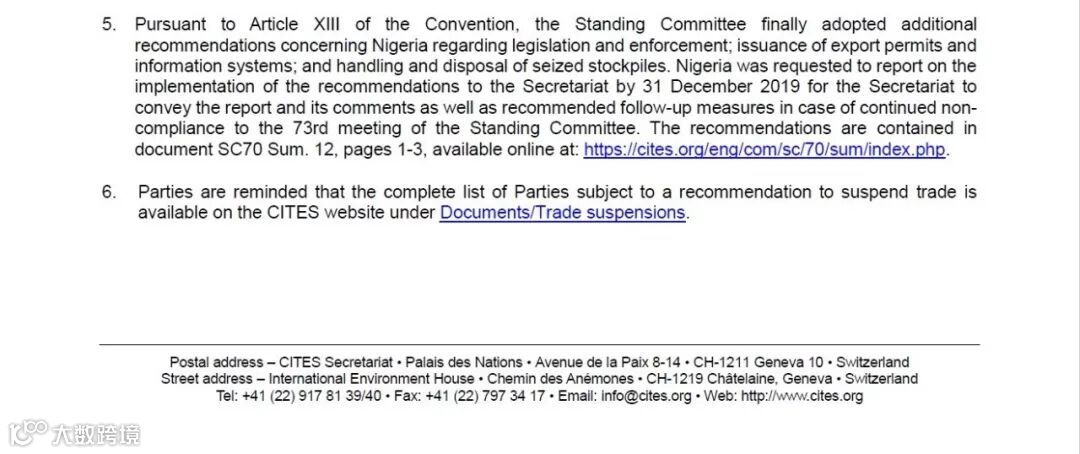 5. 根据公约第十三条(Article XIII of the Convention),常务委员会最后通过了关于尼日利亚相关立法和执法的其他建议;签发出口许可证和信息系统;以及处理和处置缉获的库存。要求尼日利亚在2019年12月31日之前向秘书处报告与建议(本缔约方通知)相关的执行情况,以便秘书处在CITES第73届常委会(SC73)可作出报告并就后续可能的违规贸易行为进行评判和制定后续建议措施。