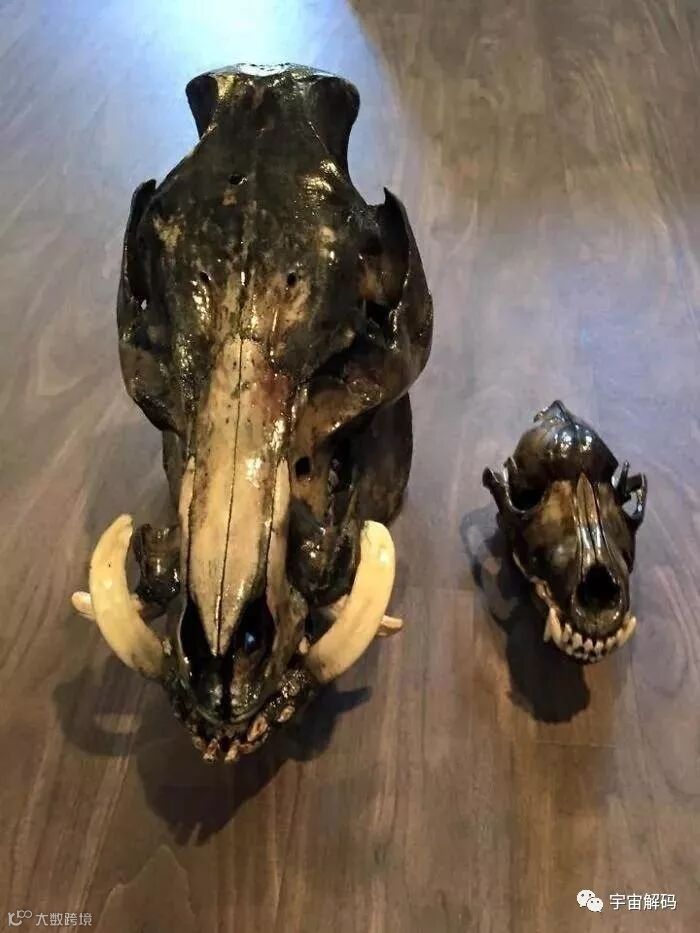 野猪的战斗力是很强的,左边是野猪头骨,右边是成年狼的头骨