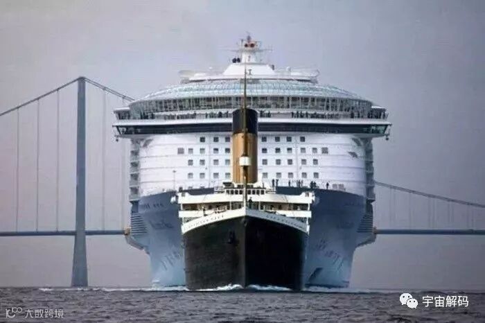 泰坦尼克号(前)和现代游轮“海洋绿洲号”(后)的尺寸相差甚远