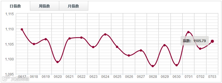 7月3日,中国木材指数(CTI)报收1206.17点,涨2.17点,涨幅0.18%。广州鱼珠木材指数(YTI)收于1102.24点,涨0.84%;上海福人木材指数(FTI)报收1252.56点,涨0.94%;四川大西南木材指数(DTI)报收1321.25点,跌2.27%;中国南康木材指数(JTI)报收1693.05点,跌0.07%,平稳。