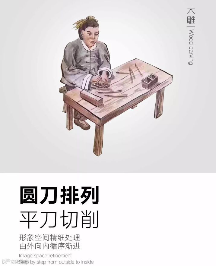 把木材雕刻成预期的形状,服务于这一目的的工具有刀、凿子,圆凿、圆锥、扁斧和锤子,木雕创作者对于形象空间的处理,在长年累月的经验中发展成了独特的技法,由外向内,一步步通过减去肥料,循序渐进的将形体挖掘显现出来,在一次次从的减法造型中,体会不同雕刻手法的特殊韵味。