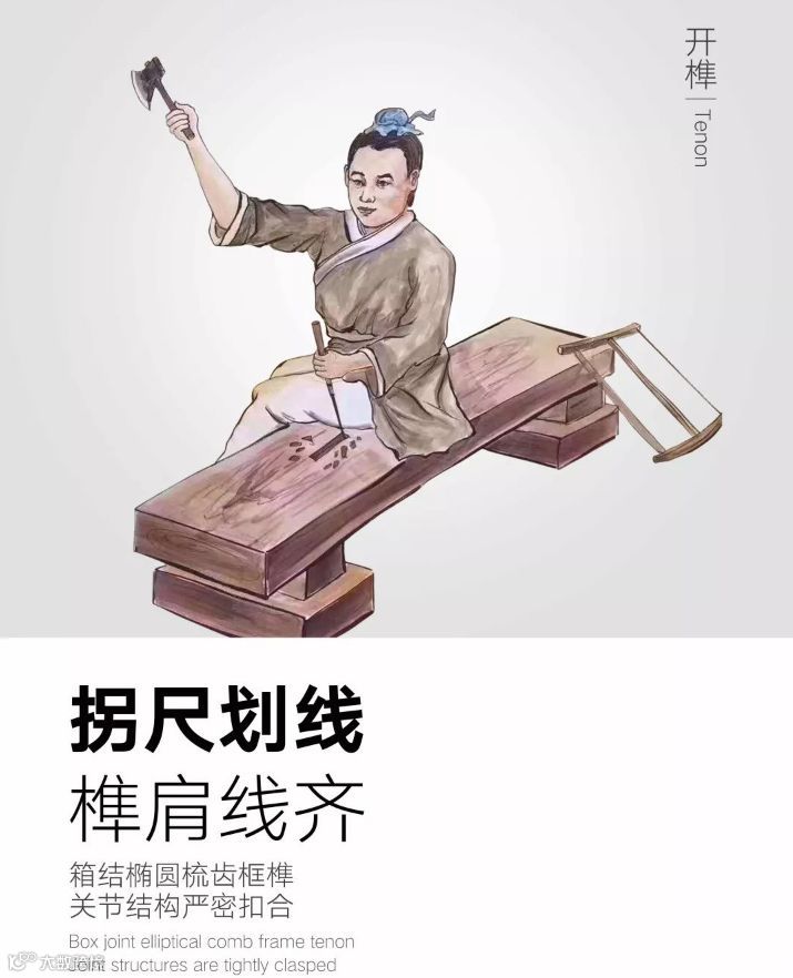 榫卯是在两个木构件上所采用的,一种凹凸结合的连接方式,凸出部分叫榫(或榫头),凹进部分叫卯(或榫眼),榫和卯咬合,起到连接作用,这是中国古代家具的主要结构方式,箱结榫、椭圆榫、梳齿榫、框榫,拐尺划线,榫肩线齐,关节结构严密扣合。