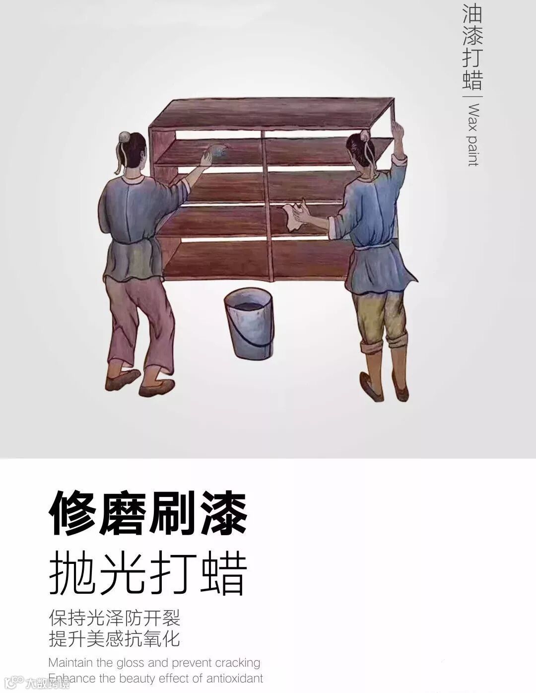 用粗砂纸打磨涂漆部位,用布沾水,弄成半湿状,擦干净粉末,从上到下,从左到右,精细刷漆,顺着木材纹理的方向将上光蜡擦到家具上,保持光泽度防开裂,提升美感抗氧化。
