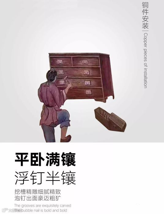 铜件不仅使家具坚固耐用,具有实用功效,还拥有丰富的文化内涵,铜件身材虽小,却能直接影响到家具品位、价值,甚至使用寿命,平卧满镶,浮钉半镶,挖槽精雕细腻精致,泡钉出面豪迈粗犷,两种不同的安装手法,各具特色,至此,一件家具就产生了!
