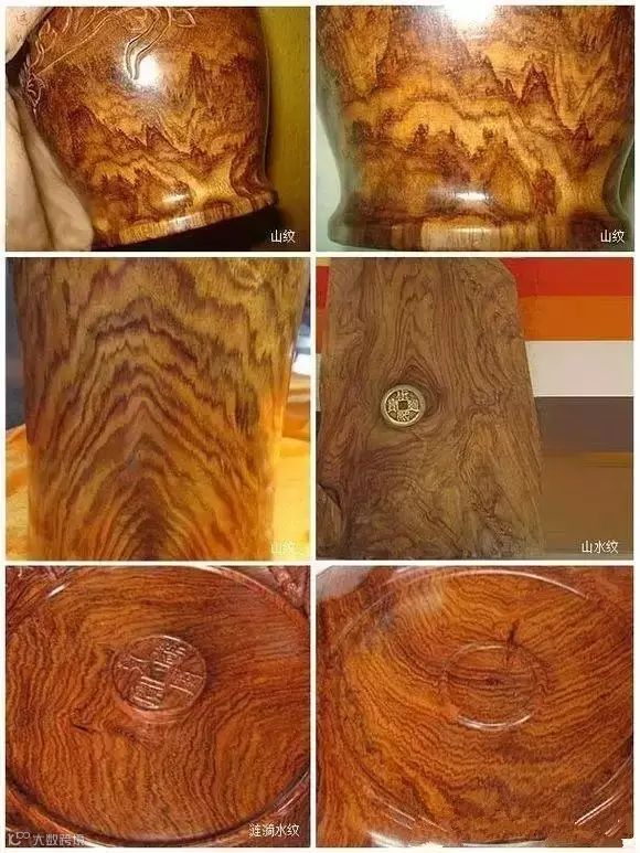 山水纹在木纹里,其实是两个概念,是山纹和水纹(俗称水波)的统称。其纹理由酷似山水画,如山峰,如水波,皆可称为山水纹。山水纹并非海黄独有,樱桃木、胡桃木等都有类似的纹理。