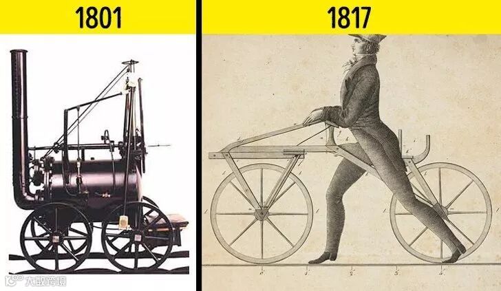 第一辆火车膨化魔鬼 (Puffing Devil) 是由英国工程师Richard Trevithick在1801年发明的,而第一辆自行车的原型:两轮装置Laufmaschineg是由1817年由德国教授Baron Karl von Drais打造。