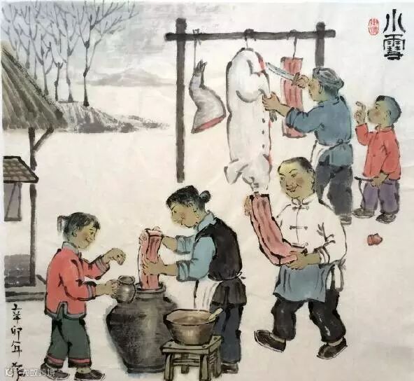 小雪时,腌腊肉是南方人最熟悉的民俗。所谓“冬腊风腌,蓄以御冬”,小雪后气温急剧下降,天气变得干燥,是加工腊肉的好时候。