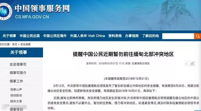 今年2月13日,外交部和中国驻曼德勒总领馆发布了暂勿前往缅北冲突地区的安全提醒,有效期至6月30日。根据当前缅北地区安全形势,中国外交领事网已将有效期延至2018年10月31日。