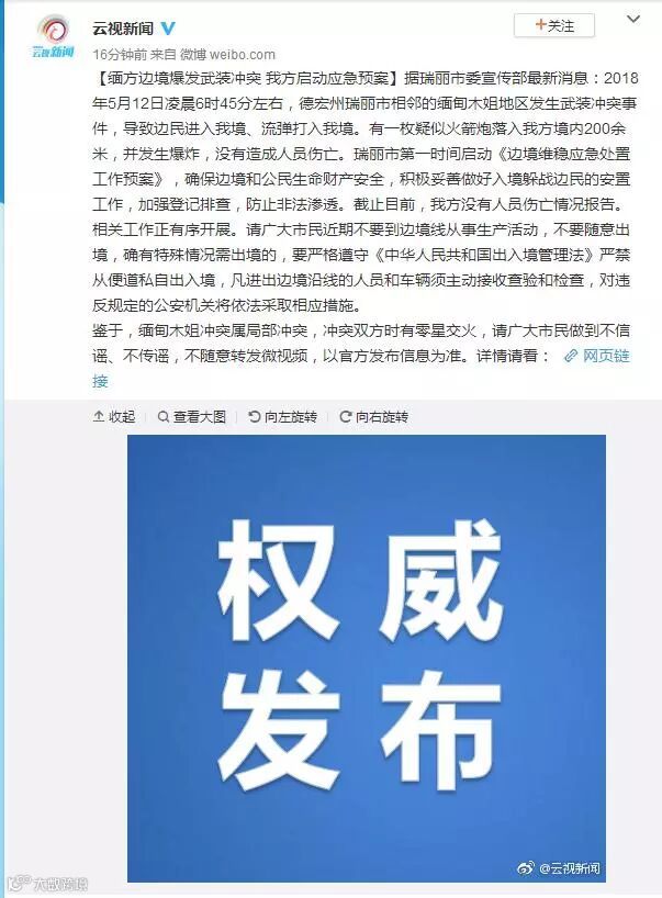 鉴于,缅甸木姐冲突属局部冲突,冲突双方时有零星交火,请广大市民做到不信谣、不传谣,不随意转发微视频,以官方发布信息为准。