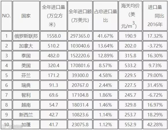 2017年全年我国共进口板枋材3739.4万立方米,其中进口来源国排名前十的国家分别是俄罗斯联邦1558.0万立方米,加拿大510.2万立方米,泰国482.0万立方米,美国320.4万立方米,芬兰171.2万立方米,瑞典91.3万立方米,智力69.6万立方米,越南54.7万立方米,新西兰42.7万立方米,加蓬41.7万立方米。其中俄罗斯联邦全年的板枋材进口量占我国2017年板枋材总进口量的比重为41.67%,是当之无愧的我国板枋材进口的第一大来源国,相比2016年,2017年我国自俄罗斯联邦进口的原木量增长了17.32%。