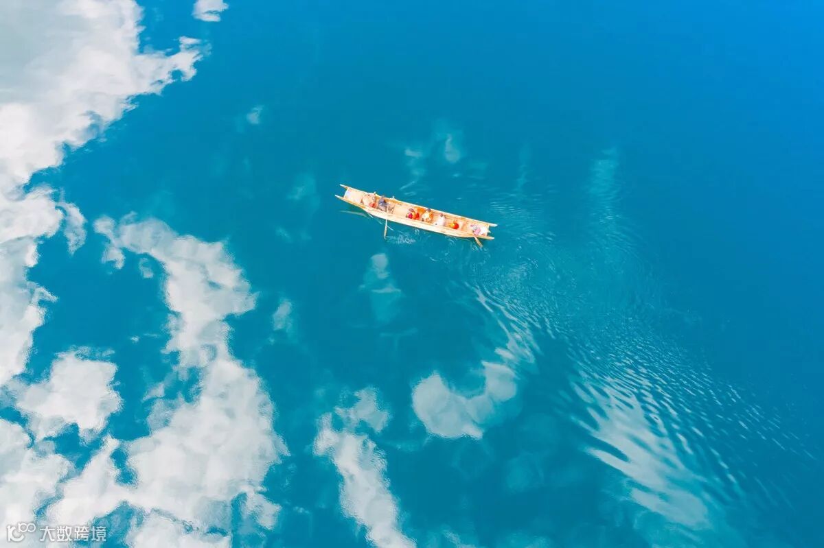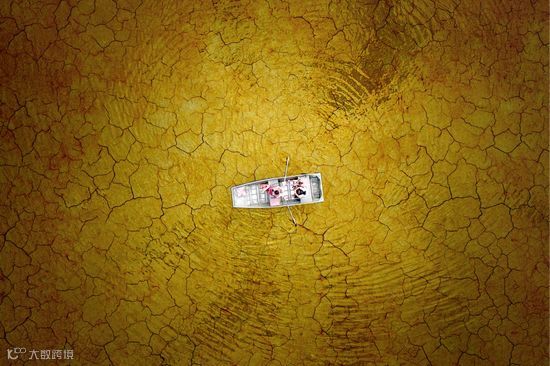 这的的确确是在湖上泛舟的照片,只是因为水质太过清澈,一眼可以见到湖底的土地,所以看起来就像是在干裂的土地上划船。