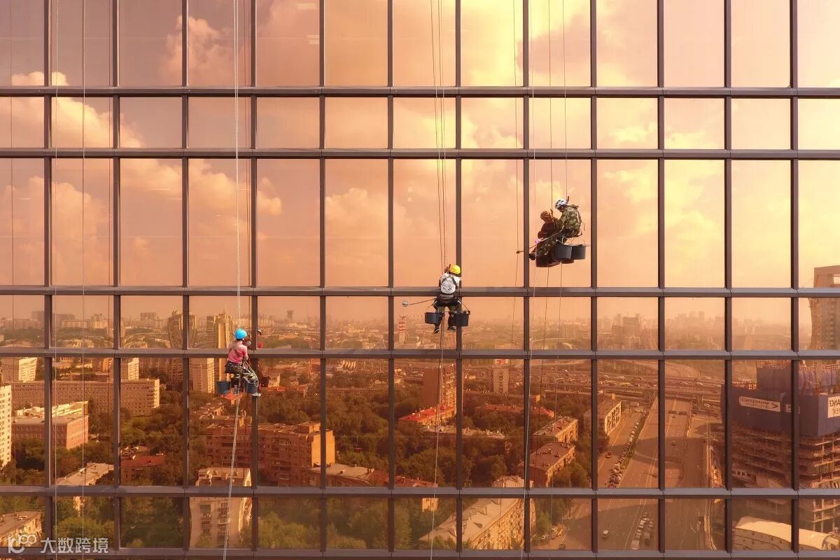 大厦的清洁工正在清洁窗外侧的玻璃,此刻的他们看起来像是会飞檐走壁的蜘蛛侠。