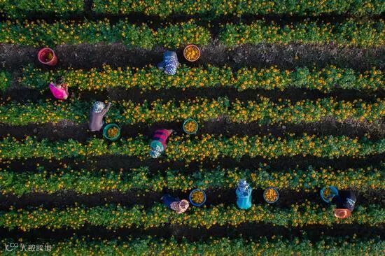园丁们正在采摘万寿菊,很有中国茶园的味道。