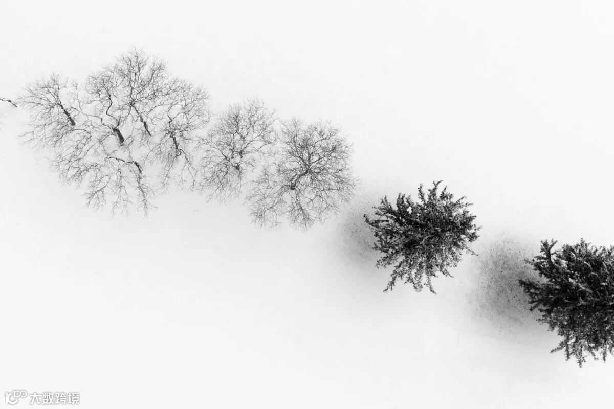 暴雪过后,只剩下树木的黑色和大雪的白色。
