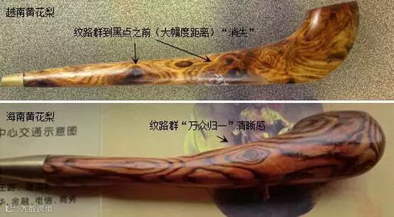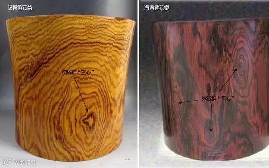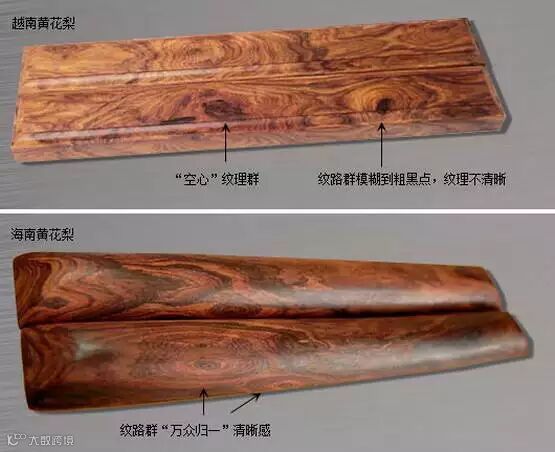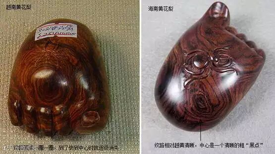 海黄区别于其它黄花梨最大的特点是"纹路群的中心" 海黄黄花梨纹路群的中心是"实"的;越南黄花梨纹路群的中心是"空"的,纹理群形成的实心称为鬼眼,“鬼眼”是作为鉴定海南黄花梨的准确指标。