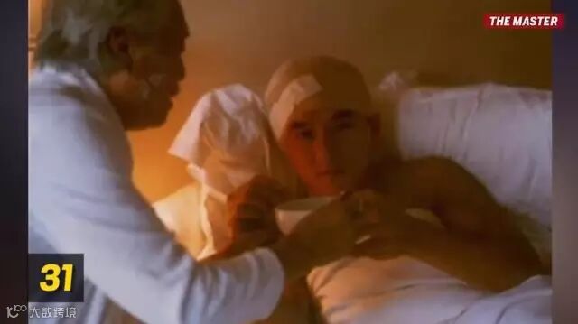 1990年 拍摄《飞鹰计划》时胸骨被打裂移位。