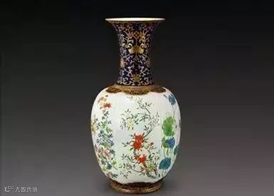 此瓶尺寸之巨,在乾隆一朝同类品种实属罕见。尤其在造型变化上,器身呈六瓣,以纬线分割,肩与颈部的对应如意纹凸起,丰满盈目。霁蓝深沉,足金描有数层纹饰,富丽堂皇,一派皇家风范。尤其粉彩的表现,把多色花卉的妩媚(芙蓉)、娇柔(莲花)、丰腴(牡丹)、清高(菊花)、冷艳(梅花)、亮丽(石榴花)表现得淋漓尽致,御窑厂的工匠们以超现实的写真能力,以博皇帝一粲。