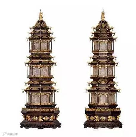 “救人一命,胜造七级浮屠”。这是中国老百姓常说的一句话。浮屠是梵语,意思就是塔。七级浮屠就是七重檐宝塔。此对紫檀七重檐宝塔,八面玲珑,共设四十八位佛龛,原置佛像四十八尊,为乾隆盛世宫廷所造。