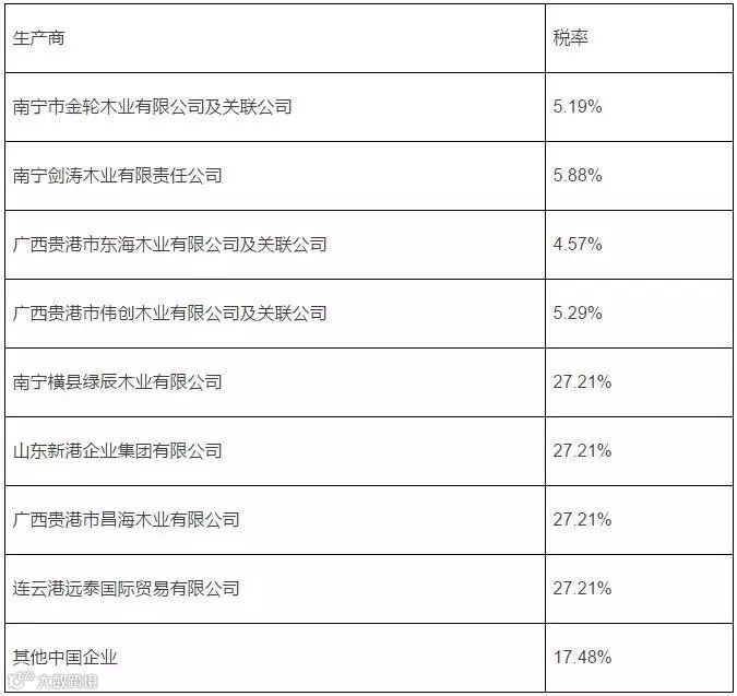 近日,韩国企划财政部通报中方,经过反倾销日落复审调查,决定继续对自中国进口的阔叶木胶合板产品(厚度大于6毫米,韩国海关税号为4412.31,4412.33和4412.34)征收为期3年的反倾销税。中国胶合板企业税率为4.57%—27.21%不等,详见下表: