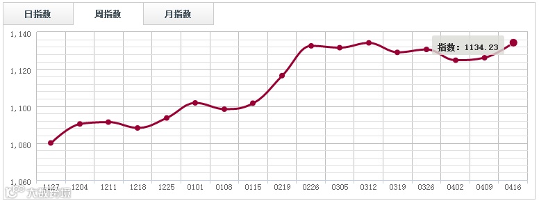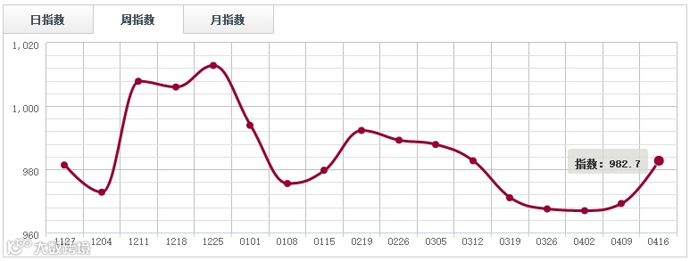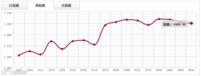 人造板分类指数持续低位徘徊本周迎来反弹机会报收982.70点,环比上涨13.52点,涨幅1.39%。三大人造板指数两涨一跌,其中四川大西南和上海福人两大指数表现积极较上周分别上涨3.04%、0.26%;广东鱼珠报收1047.13点,微跌0.19%。
