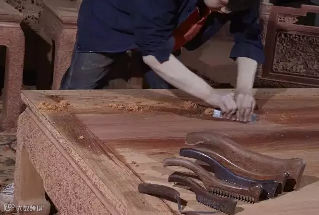 雕刻成型,木料损失18%。家具组装好,上大漆之前,要进行刮磨,使用十多种刮磨工具进行刮磨,才能使家具平整。刮磨完成后,还需要用目数不同的砂纸进行磨砂,才能使家具质感细腻。这其中,又耗费不少木料。