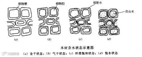 当木材中无自由水,而细胞壁内吸附水达到饱和时,这时的木材含水率称为纤维饱和点,是木材性质发生变化的转折点。其数值因树种、温度以及测定方法的不同而有差异,通常以30%作为各个树种的含水率的平均值。