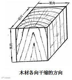 由于木材为非匀质材料,其胀缩变形各向不同,其中以弦向最大,径向次之,纵向 (即顺纤维方向)最小。当木材干燥时,弦向干缩约为6%~12%,径向干缩3%~6%, 纵向仅为0.1%~0.35%。也正是由于木材构造的不均匀性,随着木材体积的涨缩则可能引起木材的变形和翘曲。